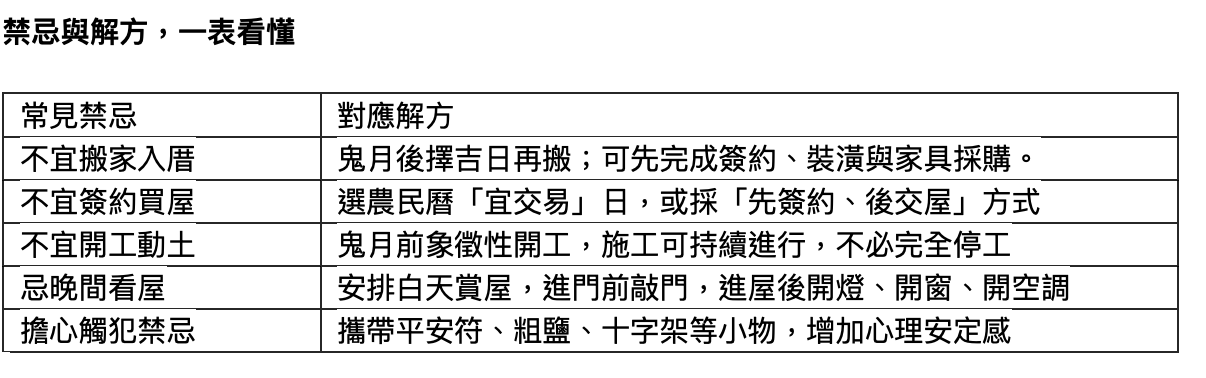 董家菱強調,鬼月並非購屋的絕對禁忌,而是取決於購屋者的心態與準備。「保持尊重、放下過度擔憂,善用時機檢驗房屋,是將鬼月轉化為購屋優勢的關鍵。」對於願意錯開人潮、細心觀察物件的買方而言,農曆七月或許正是意外的「慧買時機」。