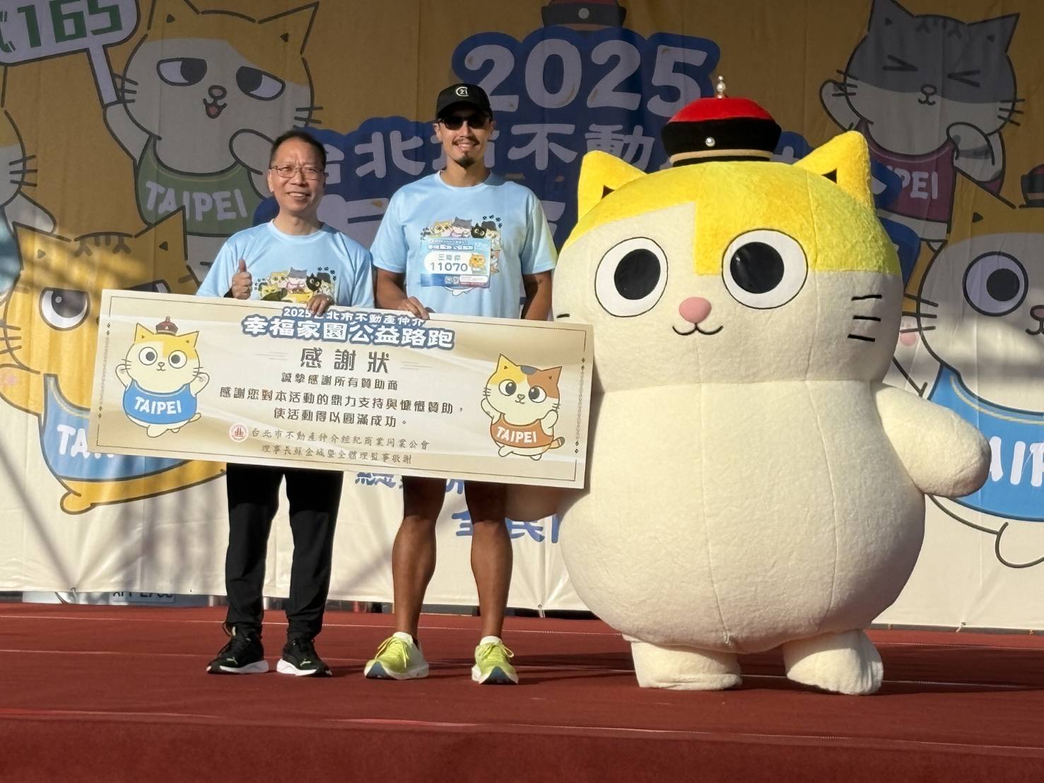 萌翻全場!超人氣IP「黃阿瑪」驚喜現身為跑者加油。21世紀不動產總經理王暐傑(圖中)代表接受感謝狀,攜手透過「萌力」與「毅力」傳遞幸福家園真義。(圖片來源/21世紀不動產)